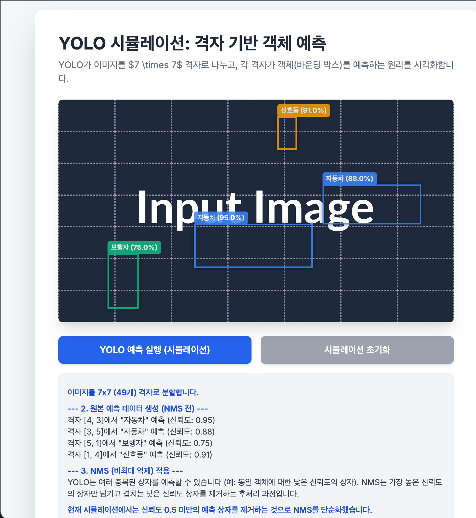 | 비최대 억제(Non-Maximum Suppression, NMS) | 하나의 객체에 대해 여러 개의 중복된 경계 상자가 예측될 때, 가정 정확도가 높은 상자 하나만을 최종 결과로 선택하는 후처리 과정입니다. |