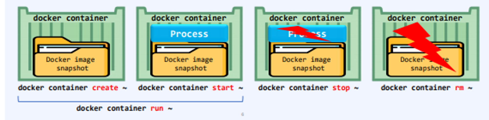 create, start, stop, rm, run 명령어를 통해 도커 컨테이너의 snapshot과 process가 각 명령어에서 어떻게 작동하는지 아래 그림을 통하여 생각하면 금방 이해가 될 것이다.