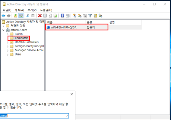 1. ADDS 서버에서 Active Directory 사용자 및 컴퓨터(dsa.msc) 에서 컴퓨터 추가된 것 확인