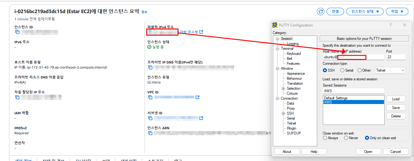 생성한 인스턴스 클릭 후 퍼블릭 IPV4 주소 확인 후 Putty에서 ubuntu@IP주소로 연결 정보 입력