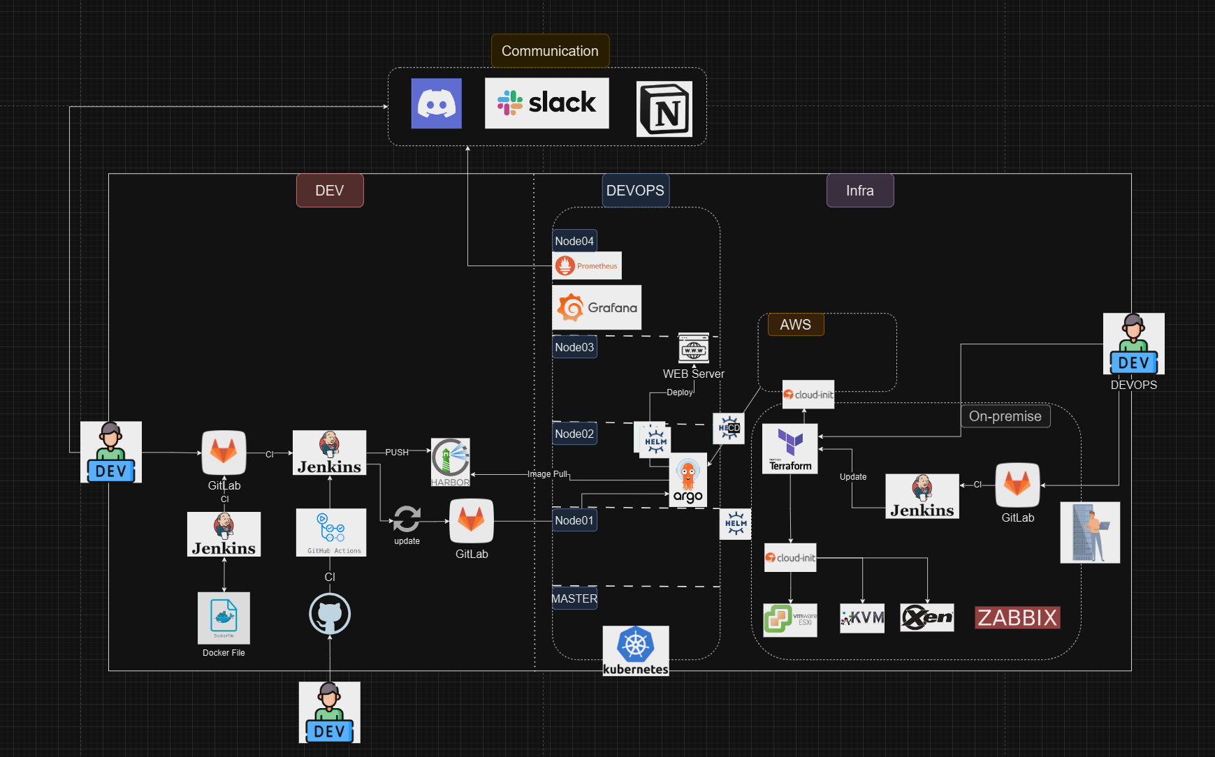 최근 DevOps의 CI/CD 파이프라인과 프로비저닝에 대한 개념이 조금씩 이해가 가면서, 저만의 DevOps 아키텍처를 설계하게 되었습니다. 이 과정에서 GitLab, Jenkins, Helm, Terraform 등 다양한 도구를 활용하여 환경을 구성하고 모니터링을 설정했습니다. 오늘은 제가 이해한 내용을 바탕으로 DevOps 엔지니어의 관점에서 인프라를 구성하는 방법과 각 도구의 역할에 대해 공유해보겠습니다.