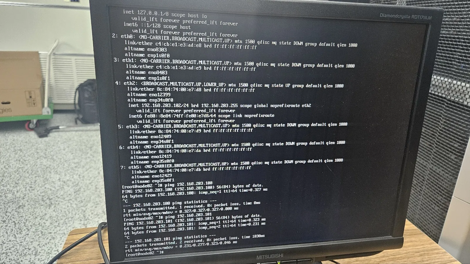 왼쪽에 2port에 Lan cable을 장착 한 것이 아니라 신규 추가한 4port에 Lan cable 장착함 - 따라서 네트워크 이더넷의 MAC 주소를 비교하여 ip를 세팅하니 정상적으로 통신이 되었다.