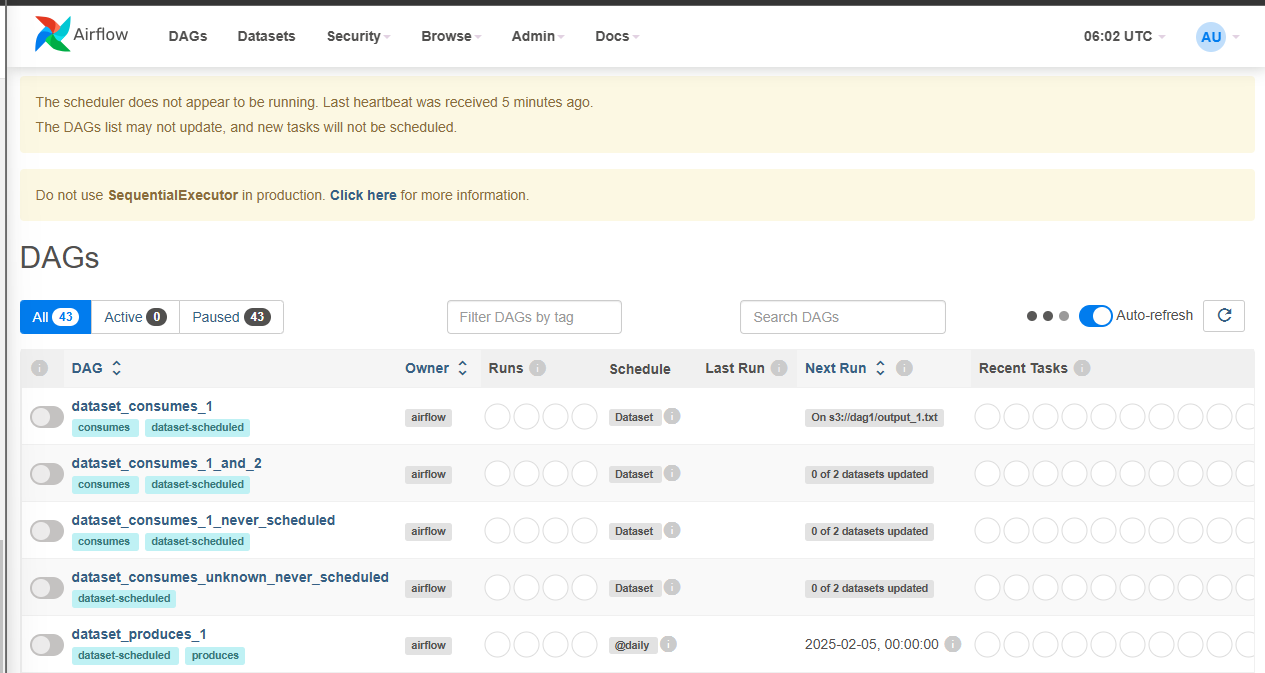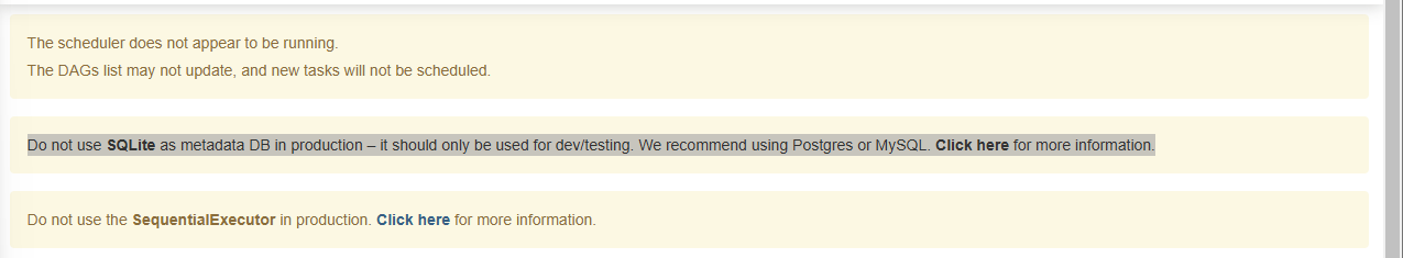 웹페이지 접속시 이러한 문구가 웹 페이지 상단에 올라온다. Do not use SQLite as metadata DB in production – it should only be used for dev/testing. We recommend using Postgres or MySQL. Click here for more information.