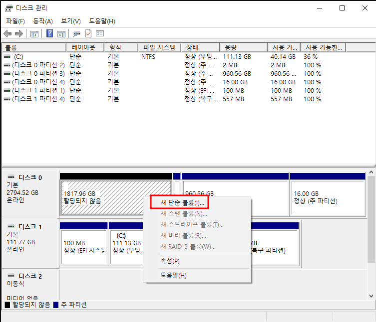 그래서 윈도우 운영체제로 돌아와서 디스크 관리를 들어가 파티션을 수정 후 다시 로키 리눅스 환경을 설치하였다.