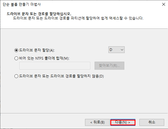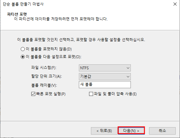 - 파티션 초기화 후 윈도우에서 사용할 파티션 할당!