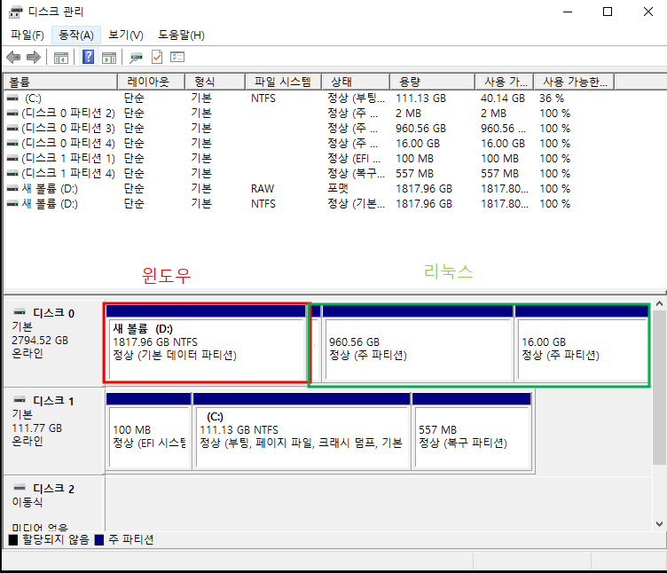리눅스 설치 할 때 D 드라이브 용량 전체인 2테라를 전부 사용해 버려 윈도우 환경에서 사용할 용량이 부족하였다.