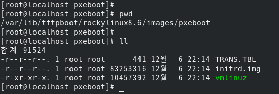/var/lib/tftpboot/rockylinux8.6/images/pxeboot 경로에 있는 vmlinuz 파일과 initrd.img 파일을 /var/lib/tftpboot/rockylinux8.6/ 경로로 이동하였다.