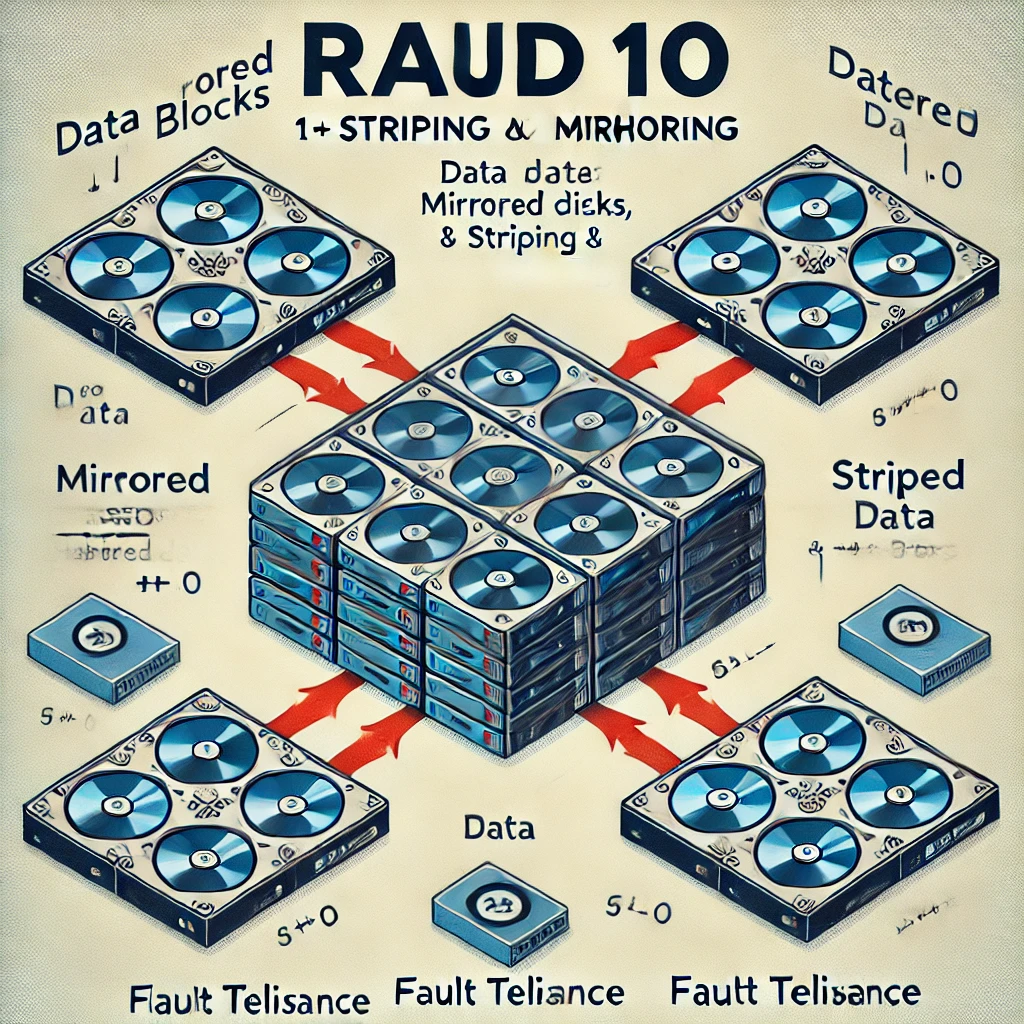 - 미러링과 스트라이핑을 결합한 방식입니다. 데이터는 미러링된 후 여러 디스크에 스트라이핑됩니다.