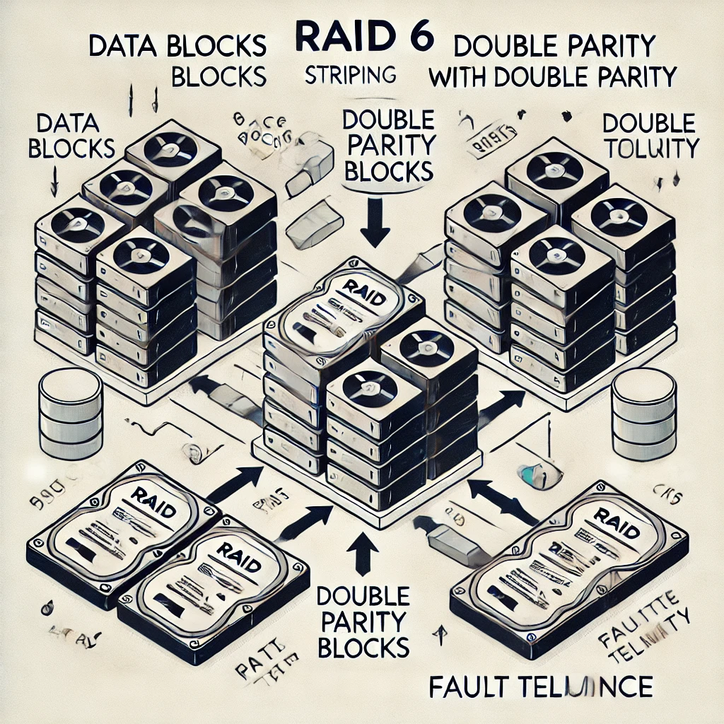- RAID 5와 유사하지만 추가 패리티 블록을 사용하여 두 개의 디스크가 고장 나더라도 데이터를 보호합니다.