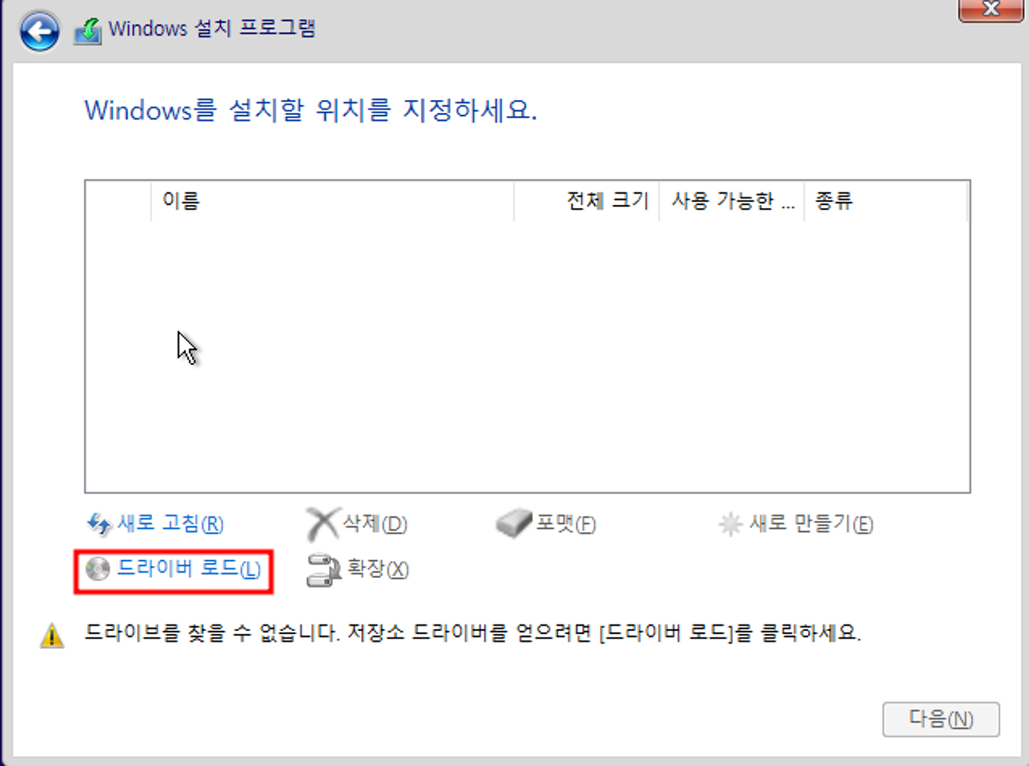 그런데 설치를 하던 중 아래와 같은 오류가 발생한다.(디스크가 보이지 않는 오류)