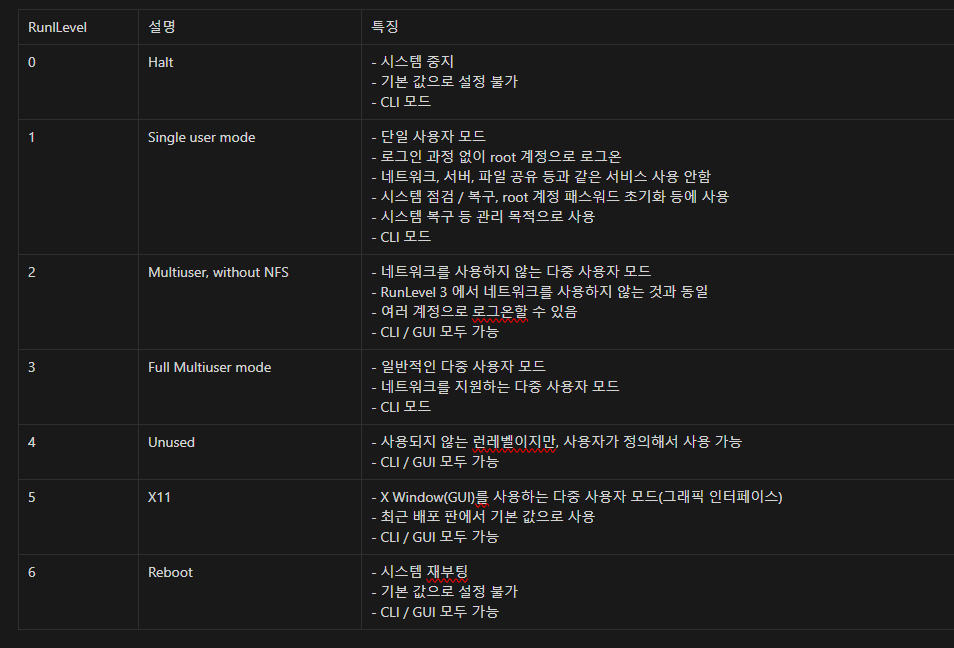 RunLevel 은 0 ~ 6 번까지 존재한다. 아래에 자세하게 설명하도록 하겠다.