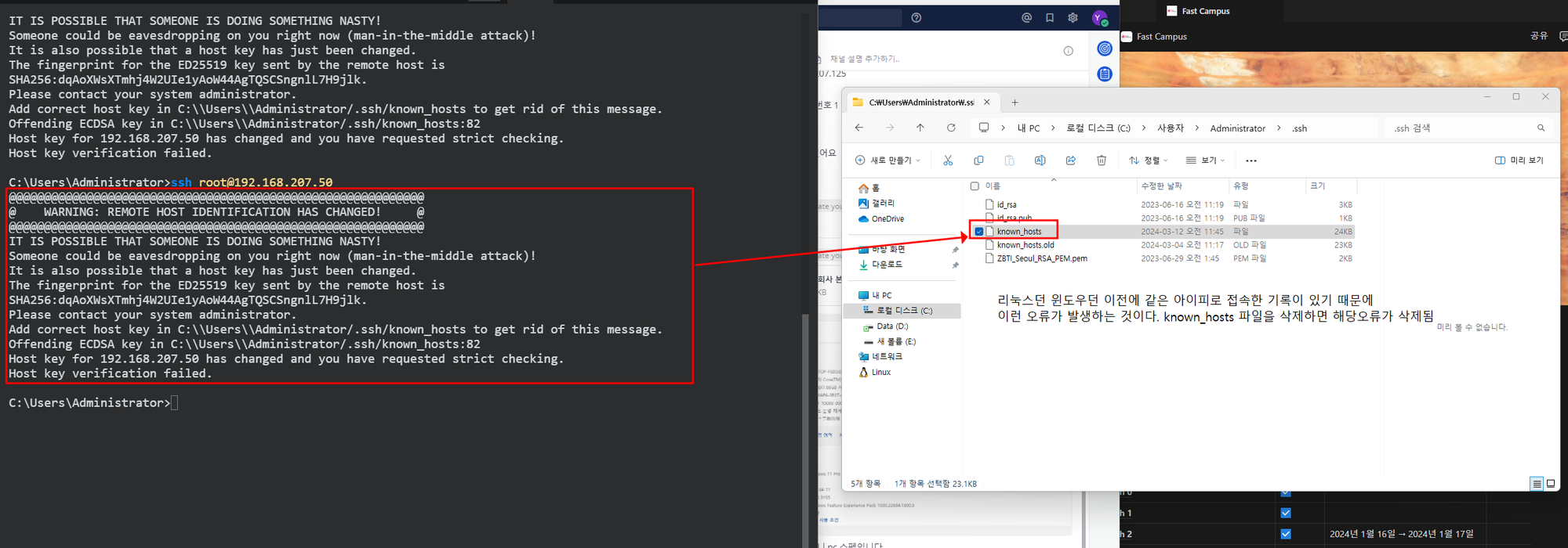 known_hosts 파일을 삭제하면 해당 오류가 삭제됨